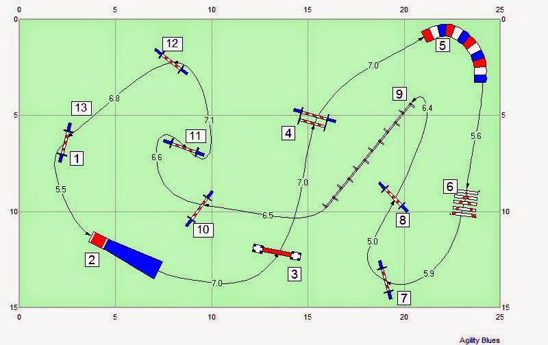 Eiliset treenit nimittäin. Rata näytti kivalta ja treenautin sen omalla mölli-2lk ryhmälläkin :) Nopeammilla koirilla oli enemmän vaikeuksia ja hitaammilla vähemmän. Vaikeutin kulmia vielä rikkupiikkisen meidän ryhmäämme varten (tyhmä ajatus!) Ja siinäpä sitä sitten oltiin. Pysyin okseenkin ainakin uskollisena ratapiirrokselle..